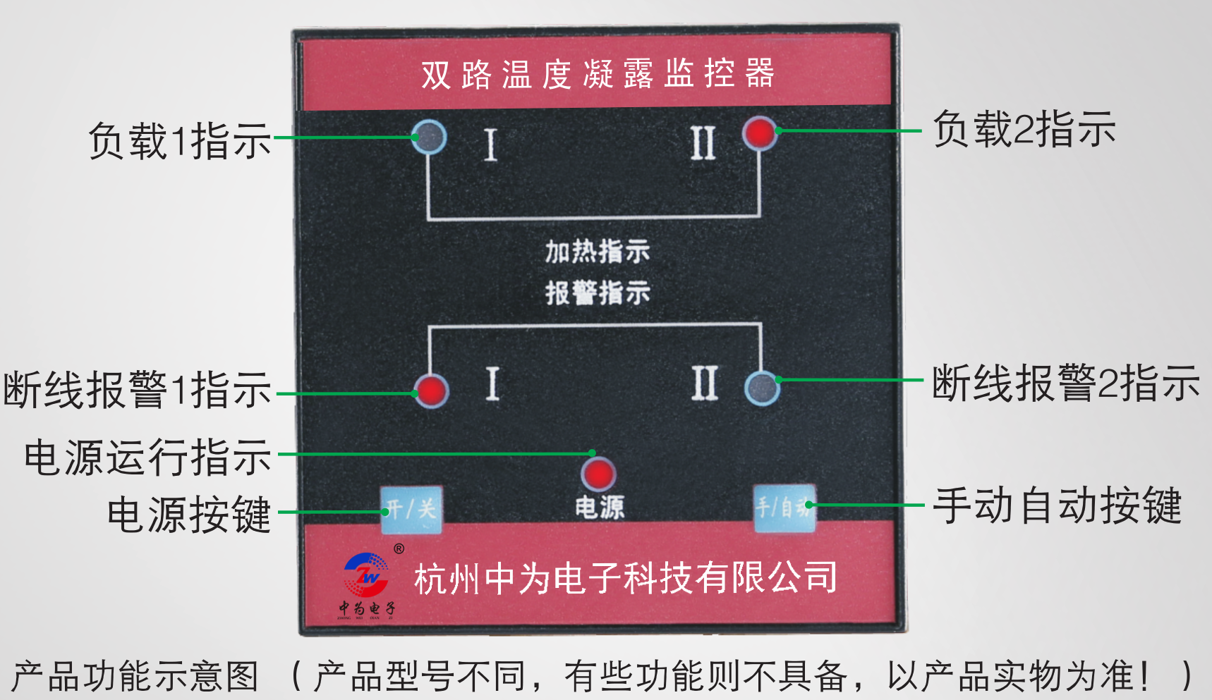 4.除凝露型:當(dāng)測量濕度值大于88%RH時,啟動除凝露負(fù)載,當(dāng)測量濕度小于75%RH時,關(guān)閉除凝露負(fù)載。